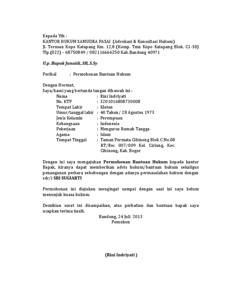 Demikianlah permohonan perlindungan hukum ini kami sampaikan mohon kiranya kearifan dan kebijaksanaan bapak agar kami yang sedang menjalankan tugas profesi sebagai advokat berdasarkan undang undang advokat yang berlaku di indonesia tidak diliputi oleh perasaan was was dan kekhawatiran yang disebabkan oleh tindakan pemeriksaan sewaktu waktu dimana seolah olah kami kami langsung menjadi pihak. 26 juni 2015 0505 8760 1 4 mohon tunggu. 29 mei 2011 1002 diperbarui. Contoh surat permohonan hukum contoh surat permohonan cuti kerja. 08 tanggal 31 mei 2016 dan surat kuasa jual nomor. 04 tanggal 13 januari 2017 y ang dibuat di notaris ayu syakira sh sk menkeh dan ham no.