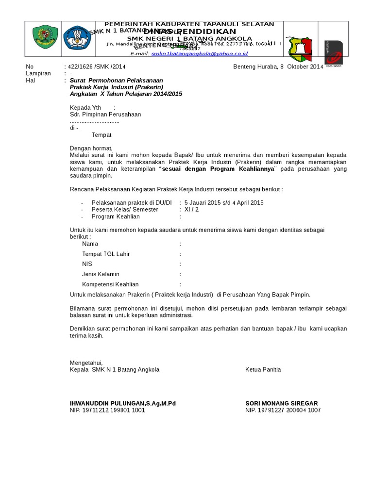 Bersama dengam surat ini saya ingin mengajukan permohonan praktik kerja lapangan pkl sebagai reporter di radar bromo probolinggo sebagai salah satu persyaratan kelulusan studi saya. Contoh surat izin pkl smk.