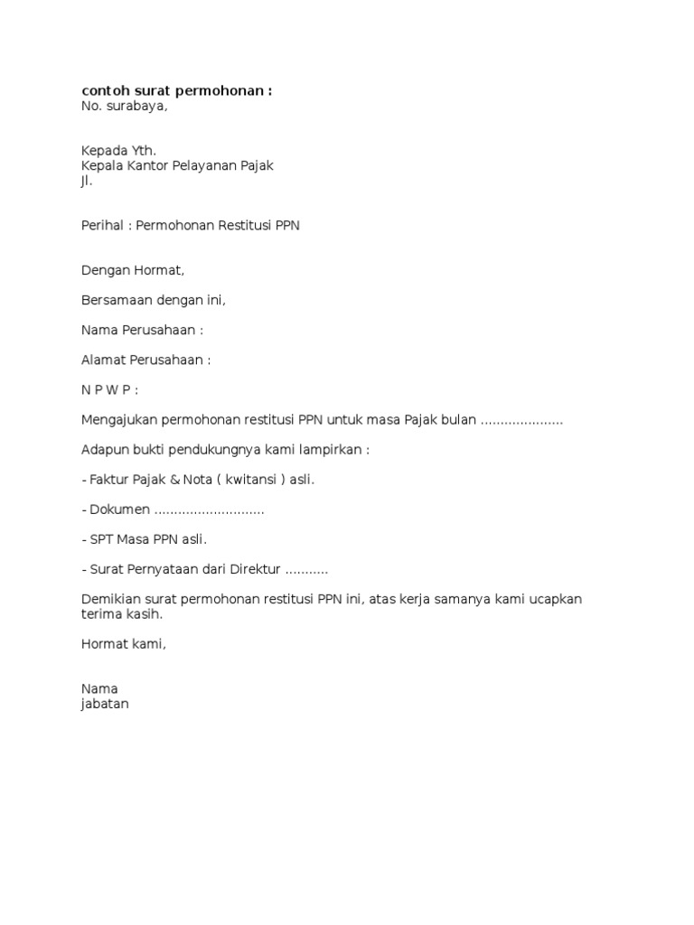 Permohonan itu bisa berupa dana izin kerjasama rekomendasi pemaafan dan lain lain. Contoh surat permohonan restitusi yang seharusnya tidak terutang. Contoh surat permohonan contoh surat permohonan maaf contoh surat permohonan kerjasama contoh surat permohonan magang contoh surat permohonan kredit contoh surat permohonan pinjaman contoh surat permohonan cuti contoh surat permohonan dana contoh surat permohonan ijin contoh surat permohonan bantuan contoh surat kuasa contoh surat lamaran kerja contoh surat contoh surat resign. Permohonan restitusi diajukan sebelum terbit skplb. Seperti kutipan diatas pasal 17b mengharuskan direktur jenderal pajak setelah melakukan pemeriksaan atas permohonan pengembalian kelebihan pembayaran pajak menerbitkan surat ketetapan pajak paling lama 12 dua belas bulan sejak surat permohonan diterima secara lengkap.