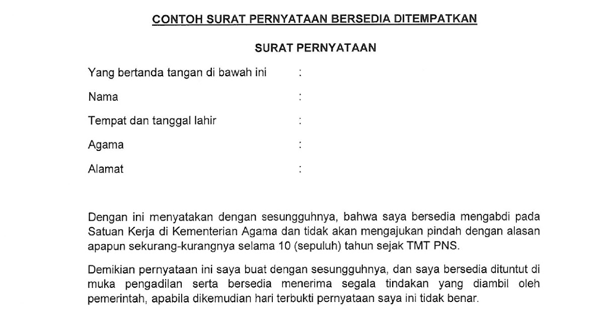 Contoh surat pernyataan bersedia ditempatkan dimana saja. Dengan ini menyatakan dengan sesungguhnya bahwa saya bersedia mengabdi pada satuan kerja di kementerian agama dan tidak akan mengajukan pindah. Saat ini masih pada tahapan pendaftaran peserta seleksi cpns semua orang fokus menganalisi formasi formasi yang tersedia serta peluang memilih jabatan dan lokasi tes yang dapat mudah bersaing dan lulus pada setiap tahapan seleksi. Pernyataan sanggup ditempatkan dimana saja ada kalanya dalam melamar pekerjaan untuk posisi yang kita inginkan kita memerlukan izin dari orang tua. Salah satu persyaratan berkas digital yang harus diunggah pada saat mendaftar yaitu surat pernyataan bersedia ditempatkan di mana saja. Contoh surat pernyataan bersedia ditempatkan dimana saja surat pernyataaan bersedia ditempatkan dimana saja biasanya dibuat oleh karyawan baru pada sebuah lembagainstasi bisnis pegawai negeri yang akan mengikuti tes kenaikan pangkat atau anggota wajib militer suatu negara. Contoh surat pernyataan bersedia ditempatkan dimana saja contoh tersebut yaitu contoh surat pernyataan dari orang tua sanggup ditempatkan dimana 9 months ago recent posts.