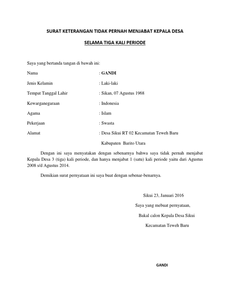 Tidak setiap orang dapat menerima surat keterangan tidak mampu ini orang yang. Contoh surat pernyataan bersedia dicalonkan sebagai kepala desa. Contoh surat rekomendasi kepala desa keuchik untuk bantuan rehap rumah. Download doc surat yang artinya kertas yang bertulis atau secarik kertas sebagai tanda atau keterangan sesuatu yang ditulis. Contoh surat pernyataan jika mengajukan atau melakukan sesuatu yang bersyarat. Jadi surat adalah alat komunikasi tertulis yang disampaikan dari satu pihak kepada pihak lain.