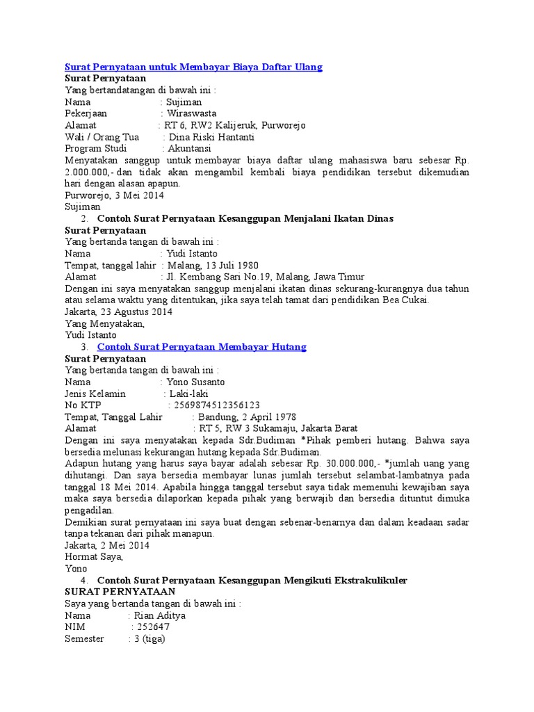 Ada banyak contoh surat pernyataan yang biasanya banyak digunakan mulai dari surat pernyataan belum menikah surat pernyataan diri surat pernyataan menyesal sampai dengan surat pernyataan kesanggupan. Hallo sobat sharing pada kesempatan ini saya akan menyajikan banyak contoh surat pernyataan kerja kesanggupan sikap belum menikah dll beserta format dan cara penyusunannyakamu pasti sedang membutuhkannya.