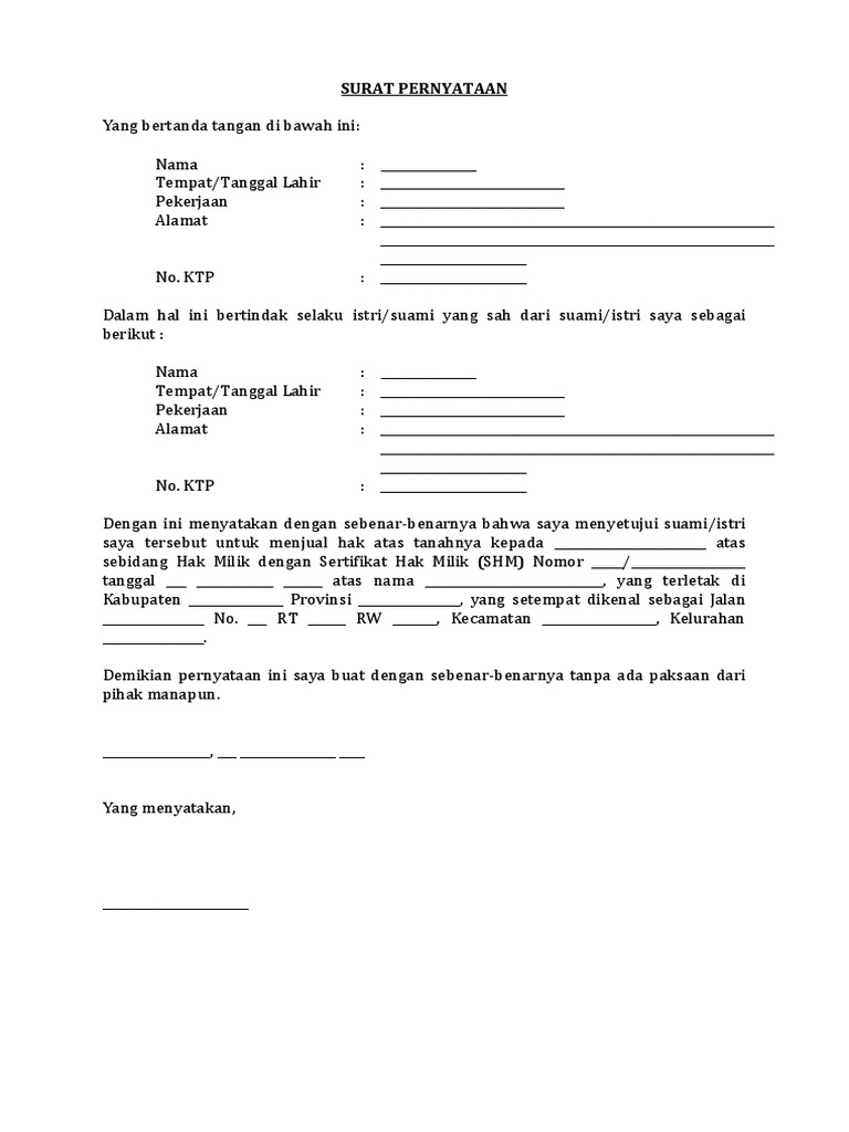 Dengan ini saya menyatakan memberikan persetujuan kepada istri saya tersebut untuk melakukan penjualan atas sebidang tanah sebagai. Berdasarkan hal tersebut diatas dengan ini saya menyatakan dengan sebenarnya bahwa saya akan menjual tanah saya tersebut dengan harga rp. Demikian surat pernyataan jual ini saya buat dengan sebenarnya agar dapat dipergunakan sebagaimana mestinya. Surat ini juga menjadi bukti bahwa kedua belah pihak yaitu penjual dan pembeli tanah sepakat untuk melakukan transaksi secara sah. 10000000 m2 sepuluh juta rupiah per meter persegi. Surat pernyataan persetujuan ini kami buat berdasarkan dari surat permohonan pemakaian ruangan atas nama karang taruna dengan nomor surat 37krtxi2016 demikian surat pernyataan ini dibuat dengan sebenarnya dan untuk dipergunakan sebagaimana mestinya.