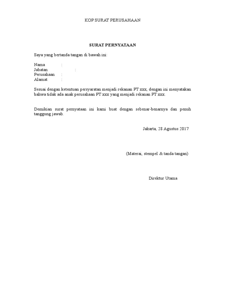Berikut ini contoh surat pernyataan kerja yang dibuat oleh calon pegawi pada saat akan masuk menjadi pegawai perusahaan. Selain itu banyak sekali fungsi semusal untuk memperkuat surat jual beli tanah dengan dibuat surat pernyataan transaksi jual beli. Contoh surat pernyataan selamat datang di portal hidupsimpel pada kesempatan kali ini kita akan membahas lengkap 11 contoh surat pernyataan. Surat pernyataan kerja dibuat oleh pihak perusahaan untuk menyatakan bahwa orang yang disebutkan di dalam surat adalah benar bekerja di perusahaan tersebut. Contoh surat pernyataan sebuah surat pernyataan sering kali dipergunakan untuk berbagai keperluan baik di dunia kerja maupun untuk keperluan perjanjian lainnya. Contoh surat lamaran kerja di perusahaan seringkali dicari oleh para pencari kerja yang ingin mengajukan lamaran pekerjaan di perusahaan perusahaan yang ada di indonesia.