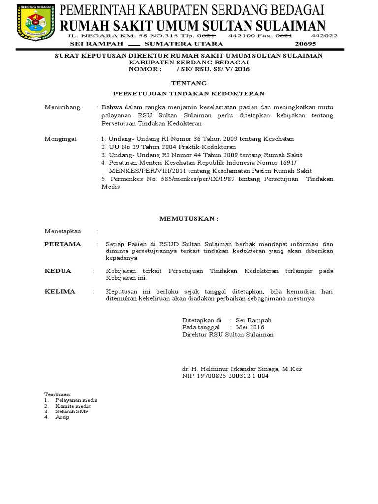 Contoh surat persetujuan tindakan medis. Surat ini juga diperlukan di dunia medis. Ketika pasien akan menempuh prosedur tertentu yang dinilai serius dan memiliki risiko risiko tertentu pihak rumah sakit atau klinik biasanya akan meminta pasien menanda tangani surat pernyataan persetujuan sebelum prosedur dilakukan. Saya juga menyetujui bila saat dilakukan tindakan medis ini dan dokter menilai perlu dilakukan tindakan medis lebih lanjut semata mata demi kebaikan pasien. Satu lagi dok apakah dokter punya contoh pedoman hpk dan panduan general consent dok. Saya di pokja hpk. Penandatanganan persetujuan disini adalah untuk pemberi persetujuan dalam pelaksanaan prosedur diagnostik pelayanan rutin rumah sakit dan pengobatan medis umum.