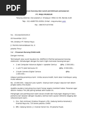 Contoh surat pesanan barang berdasarkan surat penawaran. Disamping memiliki pengaruh yang baik untuk membuat jenis usaha kita dapat laris dan laku dipasaran.