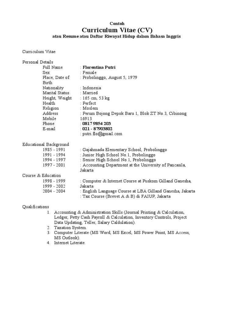 Contoh surat riwayat hidup dalam bahasa inggris. Para pelamar pekerjaan biasanya diminta untuk membuat cv atau. Cv atau nama lainnya daftar riwayat hidup dalam bahasa inggris kadang sangat dibutuhkan walaupun bekerja di perusahaan instansi dalam negeri. Contoh cv lamaran kerja doc fresh graduate dan bahasa inggris. Maka dari itu kami blog contoh surat dan proposal akan menyampekan kepada anda semua supaya anda bisa menuliskan contoh. Daftar riwayat hidup dibutuhkan ketika kita ingin melamar sebuah pekerjaan atau informasi yang sifatnya pribadi untuk dijadikan pertimbangan layak atau tidaknya seseorang. Contoh daftar riwayat hidup kreatif dalam bahasa inggris contoh cv berikutnya adalah cv kreatif dalam bahasa inggris.