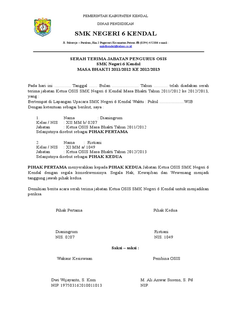 Contoh surat serah terima jabatan osis. Contoh surat serah terima jabatan osis dan karang taruna hengki kristianto. Biasanya terima jabatan ini terjadi karena adanya pergantian jabatan dari satu pihak kepada pihak yang lain. Contoh surat serah terima jabatan osis format resmi sebagai manfaat dan bahan referesi dalam membuat surat serah terima yang baik dan sah. Berita acara serah terima jabatan pengurus osis sma negeri 1 pandawai dari badan pengurus tahun pelajaran 2009 2010 kepada badan pengurus osis tahun pelajaran 2010 2011 pemerintah kabupaten sumba timur. Dinas pendidikan pemuda dan olahraga. Serah terima jabatan ialah momen yang sangat penting dalam sebuah organisasi baik itu ditingkat sekolah osis karang taruna perusahaan swasta ataupun instansi pemerintah.
