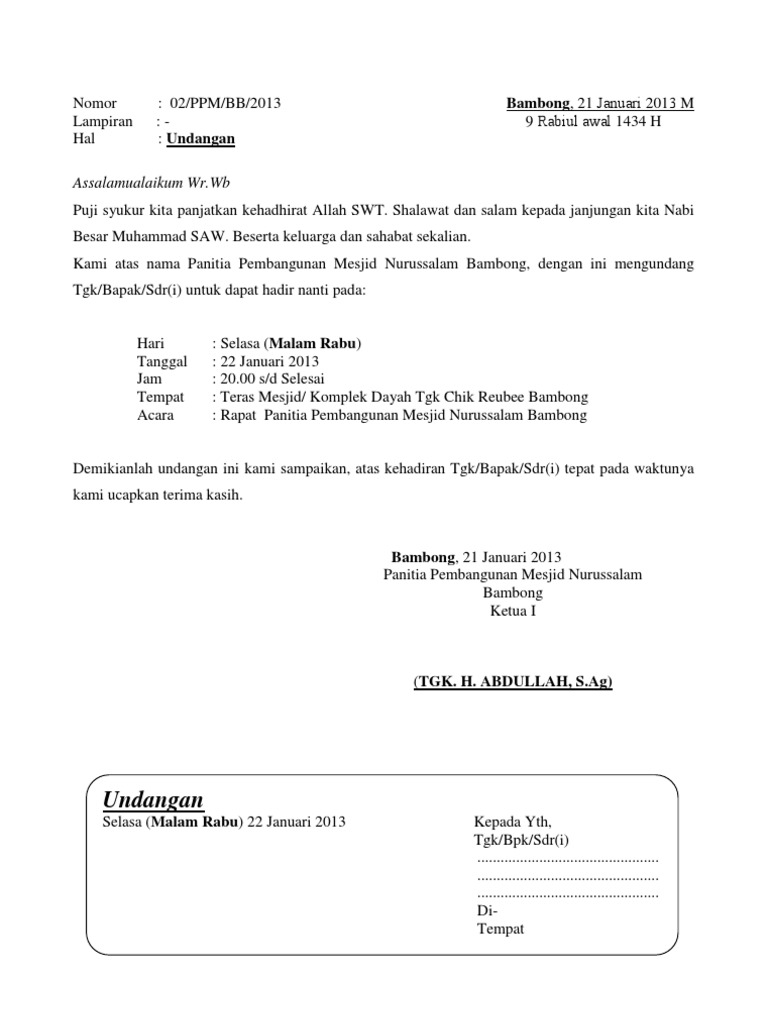 05 pmnax2012 ganjar agung 10 oktober 2012lampiran. Salah satu upaya dalam meningkatkan kenyamanan masjid adalah dengan melakukan pembangunan dan juga melakukan program pengadaan fasilitas yang belum ada di masjid. Contoh surat permohonan dana untuk pembangunan masjid undangan rapat bpd desa sariwangi undangan pertemuan wali santri doc document surat resmi contoh cara membuat surat resmi 134weo98kj47. Sepertia pada kesempatan sebelumnya dikesempatan ini kami juga akan membahas informasi seputar berbagai contoh surat yang akan kami bahas dikesempatan ini tentang kumpulan contoh surat undangan rapat yang benar bagi anda yang ingin mengetahui seperti apa seh cara. Anda bisa melihat contoh surat undangan rapat panitia pembangunan masjid dan bisa langsung mencontohnya untuk segera membangun sebuah masjid. Contoh surat undangan rapat masjid ganjaragung141 undangan rapat pengajian 2013.
