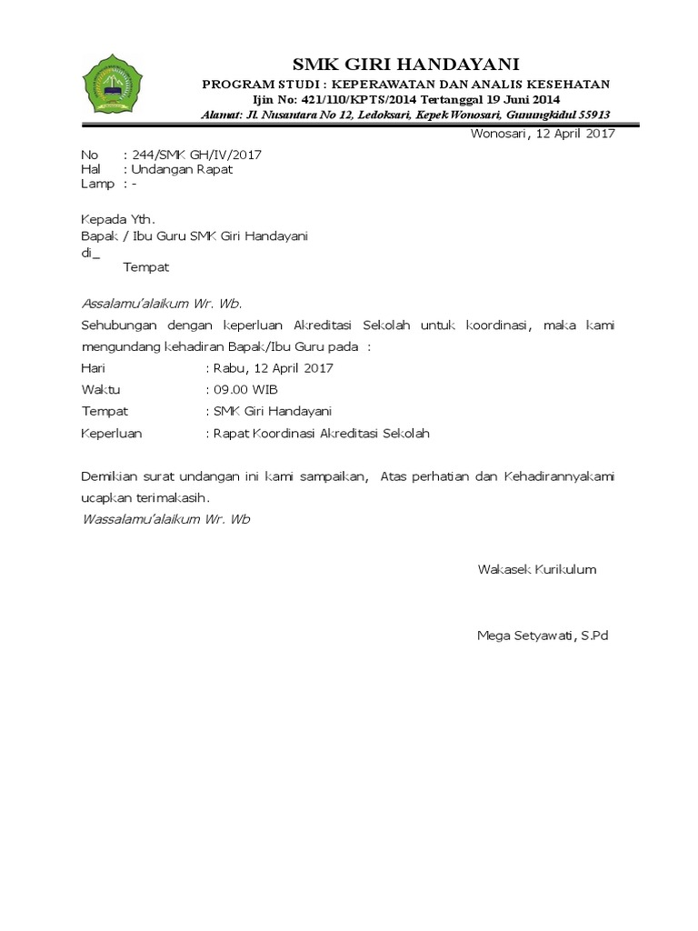Surat undangan rapat untuk mengumpulkan para guru yang ada di sebuah lembaga pendidikan ini biasanya sering dibuat dalam rangka mempersiapkan kegiatan pembelajaran. Surat undangan ini dimaksudkan agar para orang tua siswa menghadiri acara yang akan dilaksanakan. Dapatkan file penting lainnya khususnya yang berhubungan dengan surat keputusan kepala sekolah madrasah dan surat dinas paudtk sd mi smp mts sma smk ma. Contoh surat pemberitahuan setiap instansi sekolah pemerintah desa pemerintah daerah kabupaten pemerintah pusat organisasi komunitas perusahaan instansi pemerintah dan lembaga negara selalu melakukan kegiatan surat menyurat. Contoh surat undangan ulang tahun dalam bahasa inggris dan artinya. Contoh surat undangan rapat guru adalah sebagai berikut.